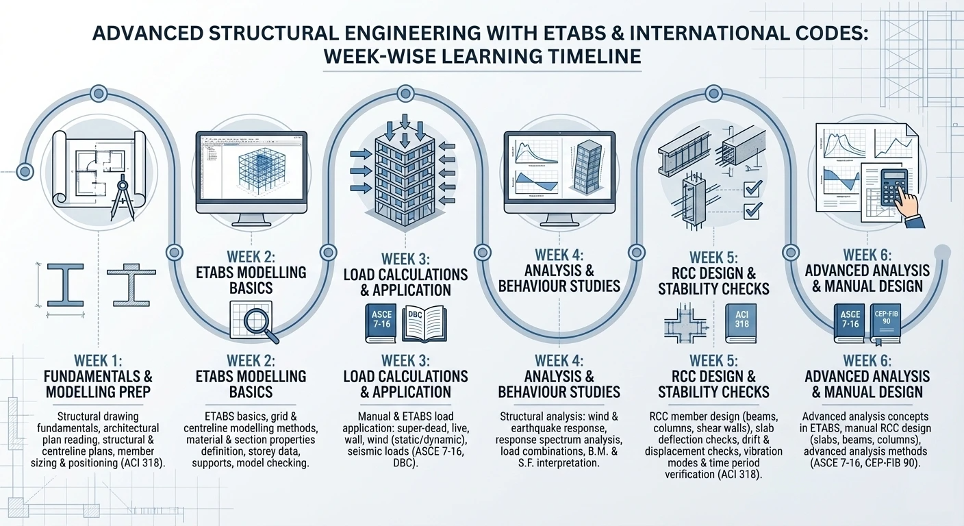 This course is a project-based structural engineering training program focused on international RCC building design workflows. This course teaches structural planning, modelling, analysis, load application, and stability checks using ETABS, strictly aligned with ACI 318, ASCE 7-16, and Dubai Building Code 2021.